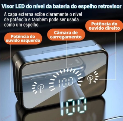 Este não é apenas um estojo de carregamento. É uma peça de tecnologia que eleva sua experiência. Com um visor LED espelhado deslumbrante, você controla o nível de bateria de cada fone e da caixa com precisão. E a surpresa? A capa externa funciona como um espelho de bolso, perfeito para retoques rápidos, e ainda pode servir como suporte para seu celular em qualquer lugar. É a união de funcionalidade, estilo e praticidade que você nem sabia que precisava, tudo em um único dispositivo elegante.